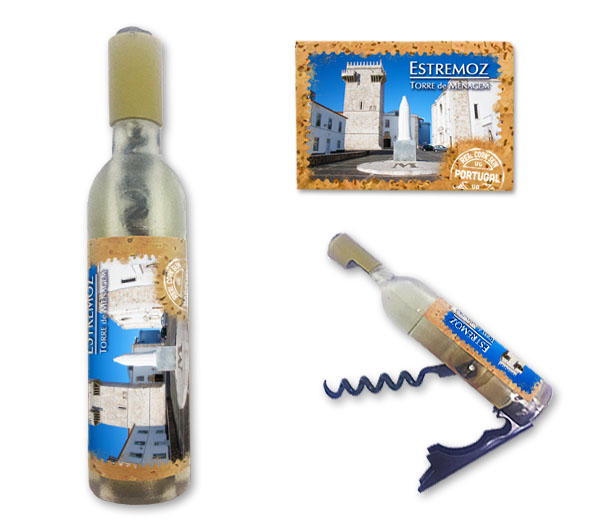 Magnetic in 11,5x2,5cm, bottle format, with capsule openers and corkscrews. Application of printed natural cork, in individual packaging.