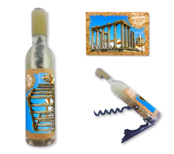 Magnetic in 11,5x2,5cm, bottle format, with capsule openers and corkscrews. Application of printed natural cork, in individual packaging.