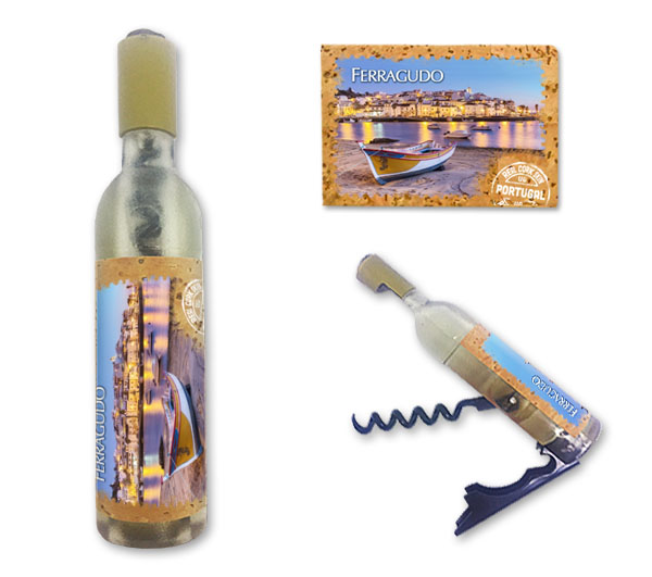 Magnetic in 11,5x2,5cm, bottle format, with capsule openers and corkscrews. Application of printed natural cork, in individual packaging.