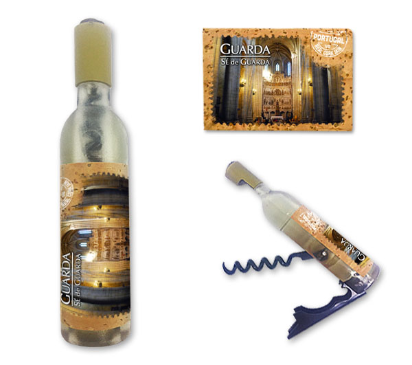 Magnetic in 11,5x2,5cm, bottle format, with capsule openers and corkscrews. Application of printed natural cork, in individual packaging.