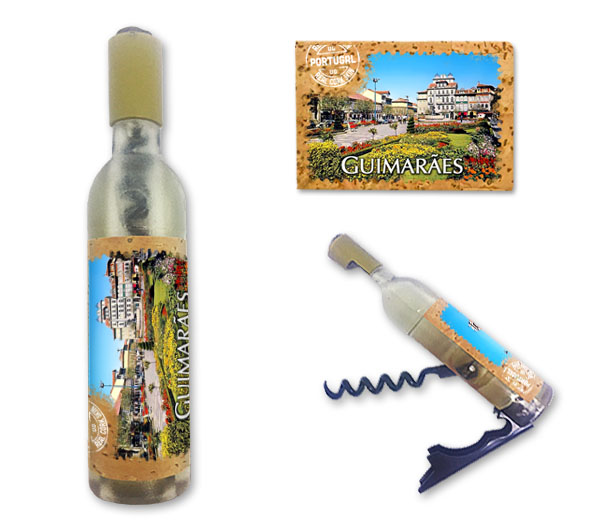 Magnetic in 11,5x2,5cm, bottle format, with capsule openers and corkscrews. Application of printed natural cork, in individual packaging.