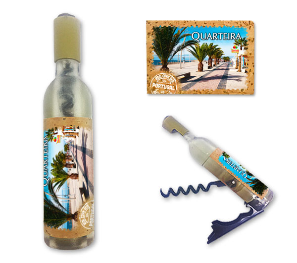 Magnetic in 11,5x2,5cm, bottle format, with capsule openers and corkscrews. Application of printed natural cork, in individual packaging.