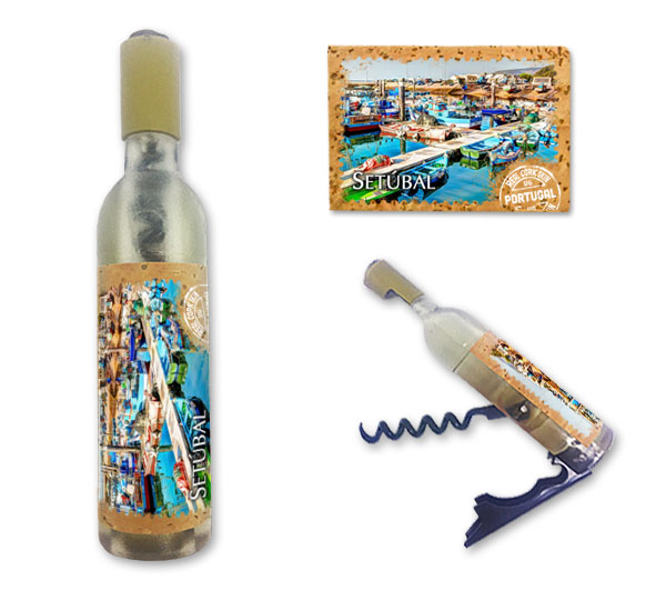 Magnetic in 11,5x2,5cm, bottle format, with capsule openers and corkscrews. Application of printed natural cork, in individual packaging.