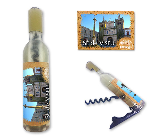 Magnetic in 11,5x2,5cm, bottle format, with capsule openers and corkscrews. Application of printed natural cork, in individual packaging.