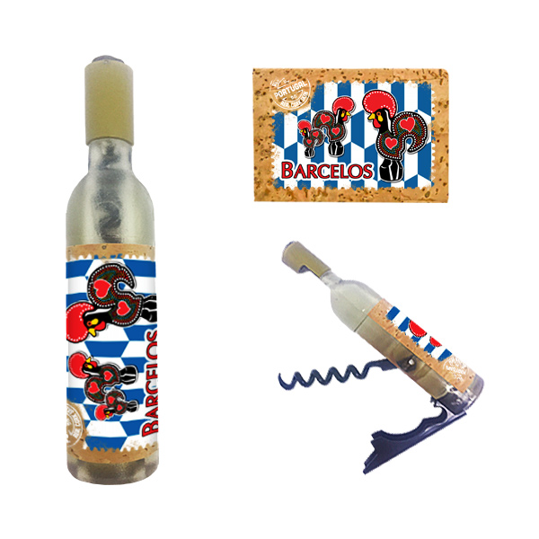 Magnetic in 11,5x2,5cm, bottle format, with capsule openers and corkscrews. Application of printed natural cork, in individual packaging.