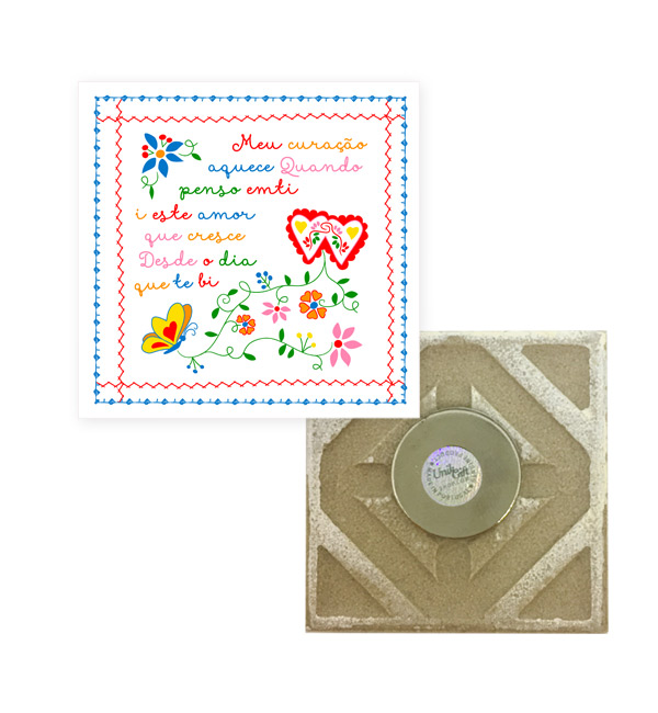 Typical theme of northern Portugal, characterized by misspelling poetry, bright colors and quotidian symbols. Ceramic tile high gloss, with magnetic neodymium on the reverse.