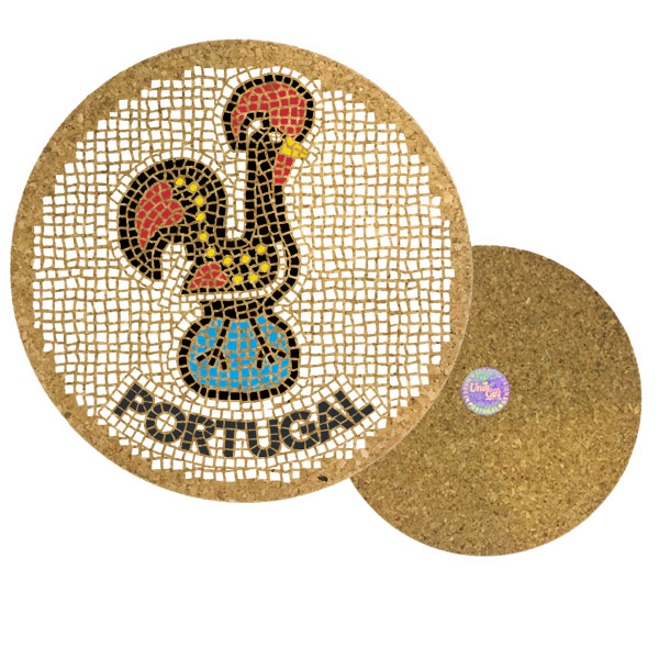 Portuguese symbols, reinterpreted in the shape of the typical Portuguese pavement. Round base for pans, in cork agglomerate of 195mm x 10mm, printed.