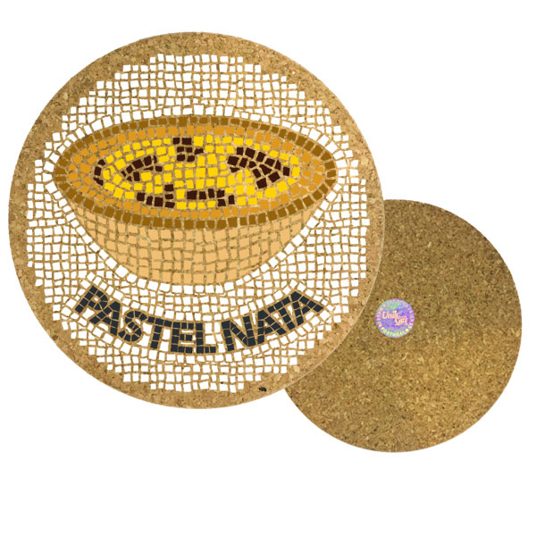 Portuguese symbols, reinterpreted in the shape of the typical Portuguese pavement. Round base for pans, in cork agglomerate of 195mm x 10mm, printed.