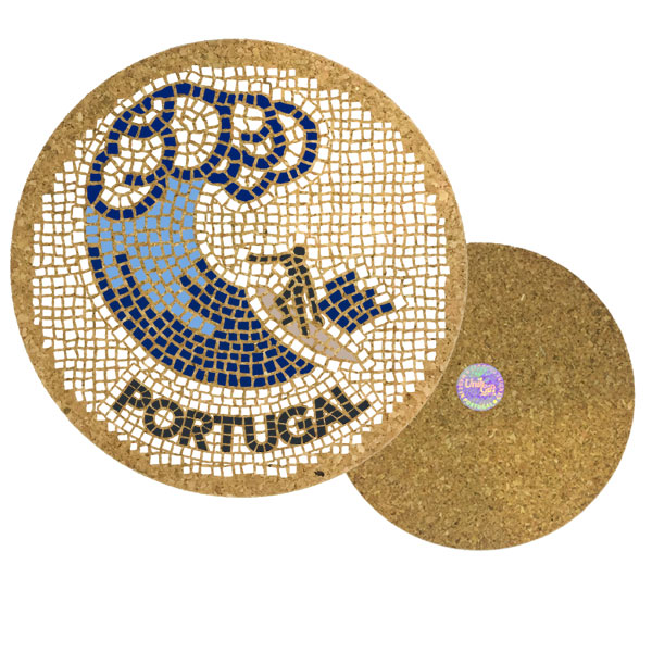 Portuguese symbols, reinterpreted in the shape of the typical Portuguese pavement. Round base for pans, in cork agglomerate of 195mm x 10mm, printed.