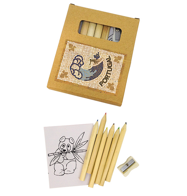 Portuguese symbols, reinterpreted in the shape of the typical Portuguese pavement. Box square pencil 7x9cm, with 6 colored pencils, pencil sharpener, color block and colored illustration in cork.