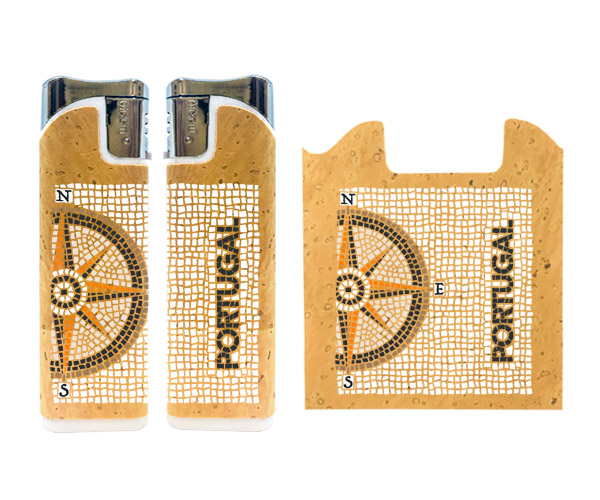 Portuguese symbols, reinterpreted in the shape of the typical Portuguese pavement. Rechargeable lighter with printed natural cork lining.