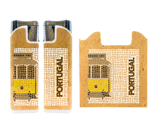 Portuguese symbols, reinterpreted in the shape of the typical Portuguese pavement. Rechargeable lighter with printed natural cork lining.