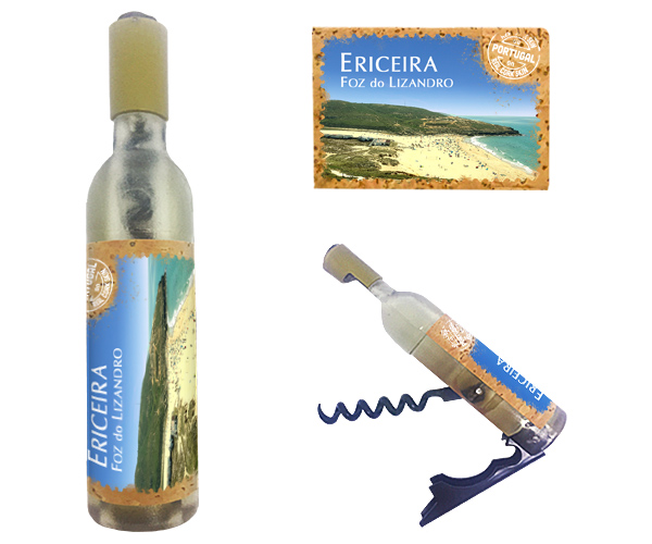 Magnetic in 11,5x2,5cm, bottle format, with capsule openers and corkscrews. Application of printed natural cork, in individual packaging.