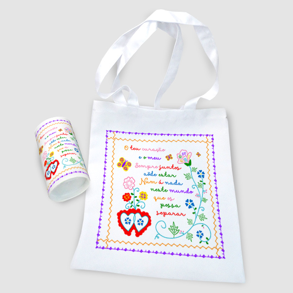 Typical theme of northern Portugal, characterized by misspelling poetry, bright colors and quotidian symbols. Illustrated fabric bag 100% polyester, 35,5 x 41cm. Packed in cardboard tube 8cm diam. x 15cm.