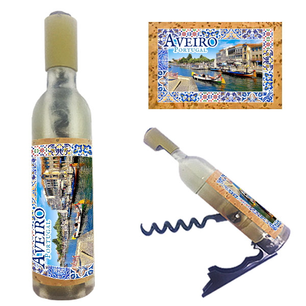 Magnetic in 11,5x2,5cm, bottle format, with capsule openers and corkscrews. Application of printed natural cork, in individual packaging.