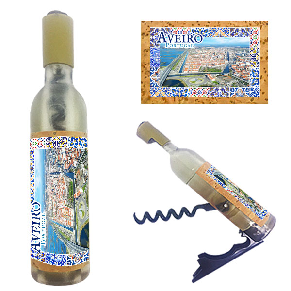 Magnetic in 11,5x2,5cm, bottle format, with capsule openers and corkscrews. Application of printed natural cork, in individual packaging.