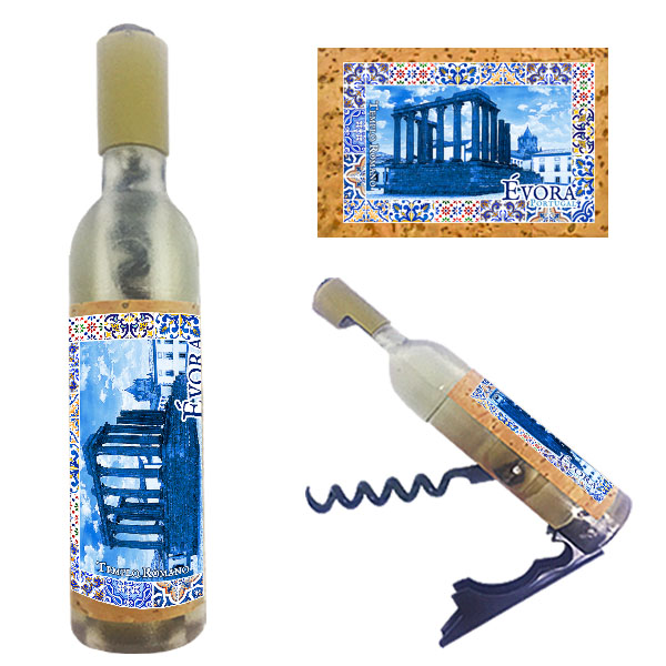 Magnetic in 11,5x2,5cm, bottle format, with capsule openers and corkscrews. Application of printed natural cork, in individual packaging.