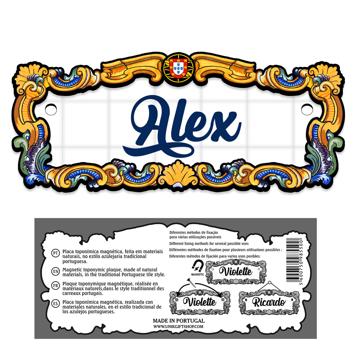 Magnetic toponymic plaque, made of natural materials, in the traditional Portuguese tile style, 14x6cm.