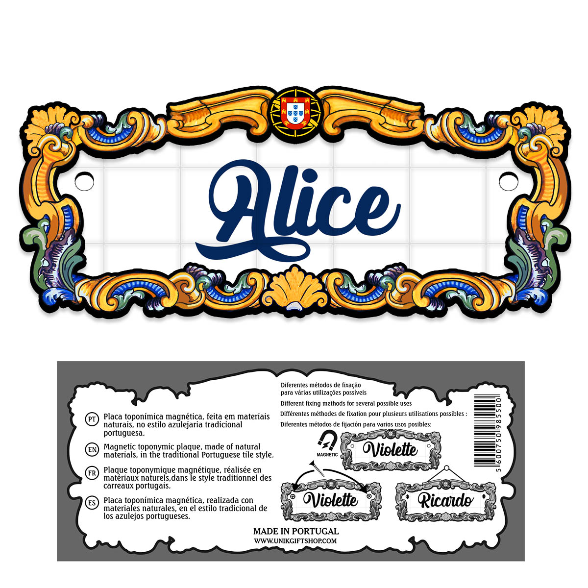 Magnetic toponymic plaque, made of natural materials, in the traditional Portuguese tile style, 14x6cm.