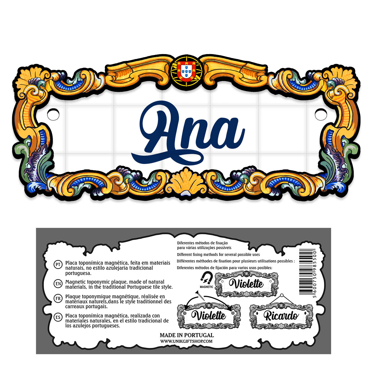 Magnetic toponymic plaque, made of natural materials, in the traditional Portuguese tile style, 14x6cm.