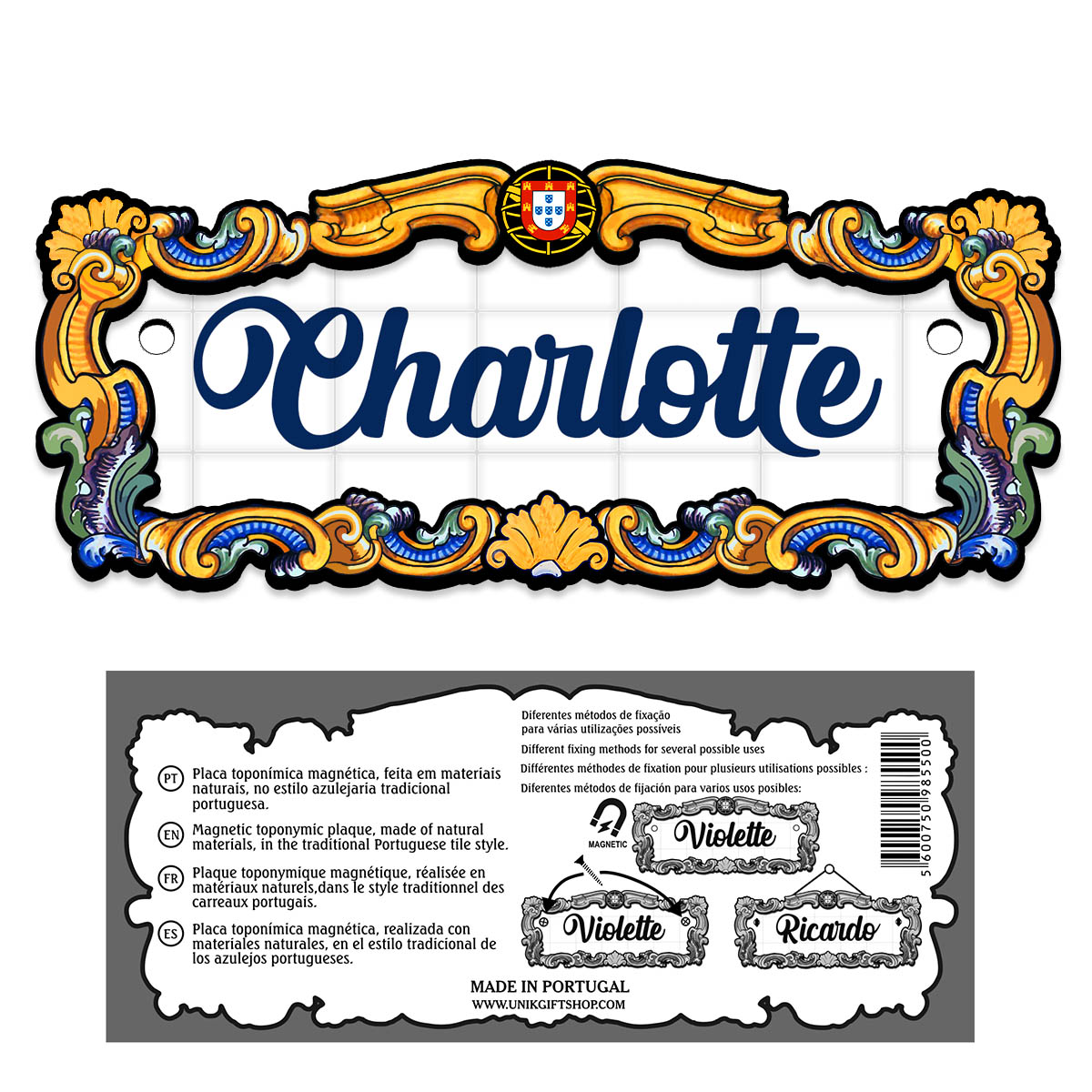 Magnetic toponymic plaque, made of natural materials, in the traditional Portuguese tile style, 14x6cm.