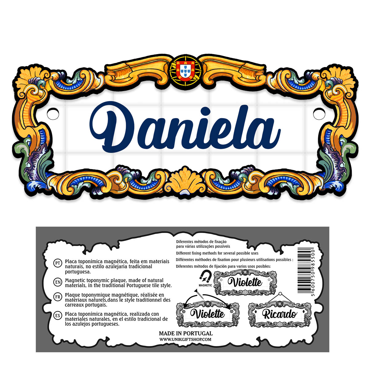 Magnetic toponymic plaque, made of natural materials, in the traditional Portuguese tile style, 14x6cm.