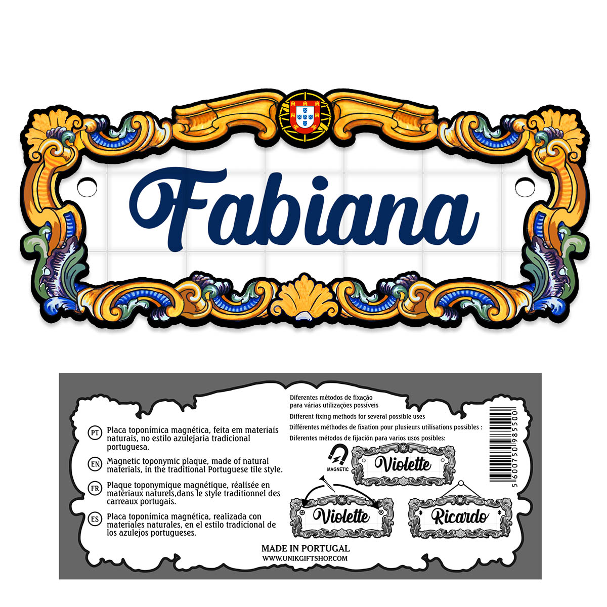 Magnetic toponymic plaque, made of natural materials, in the traditional Portuguese tile style, 14x6cm.