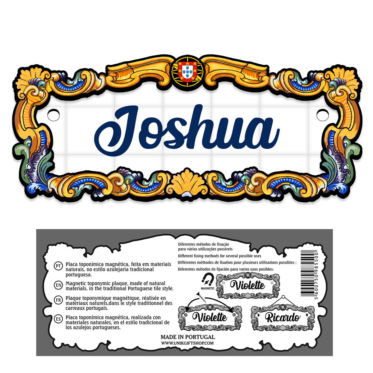 Magnetic toponymic plaque, made of natural materials, in the traditional Portuguese tile style, 14x6cm.