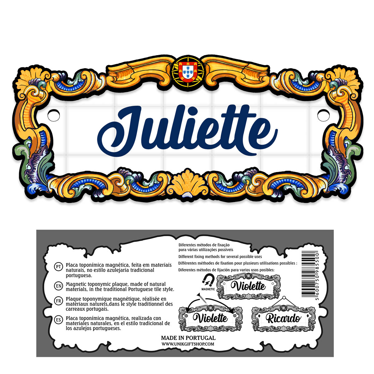 Magnetic toponymic plaque, made of natural materials, in the traditional Portuguese tile style, 14x6cm.
