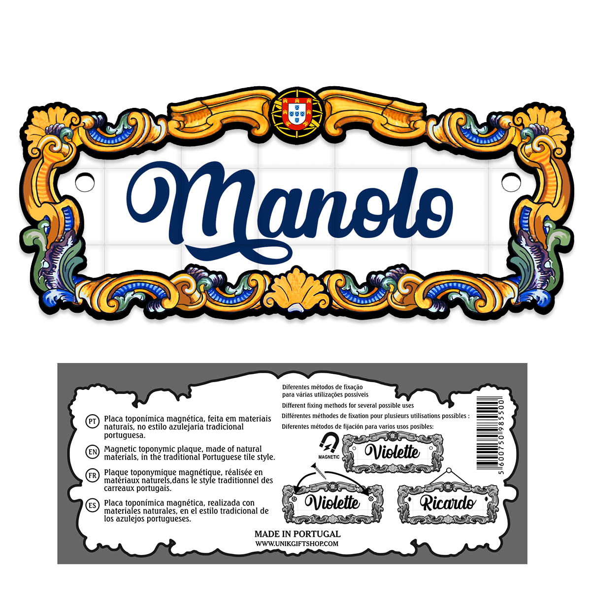Magnetic toponymic plaque, made of natural materials, in the traditional Portuguese tile style, 14x6cm.