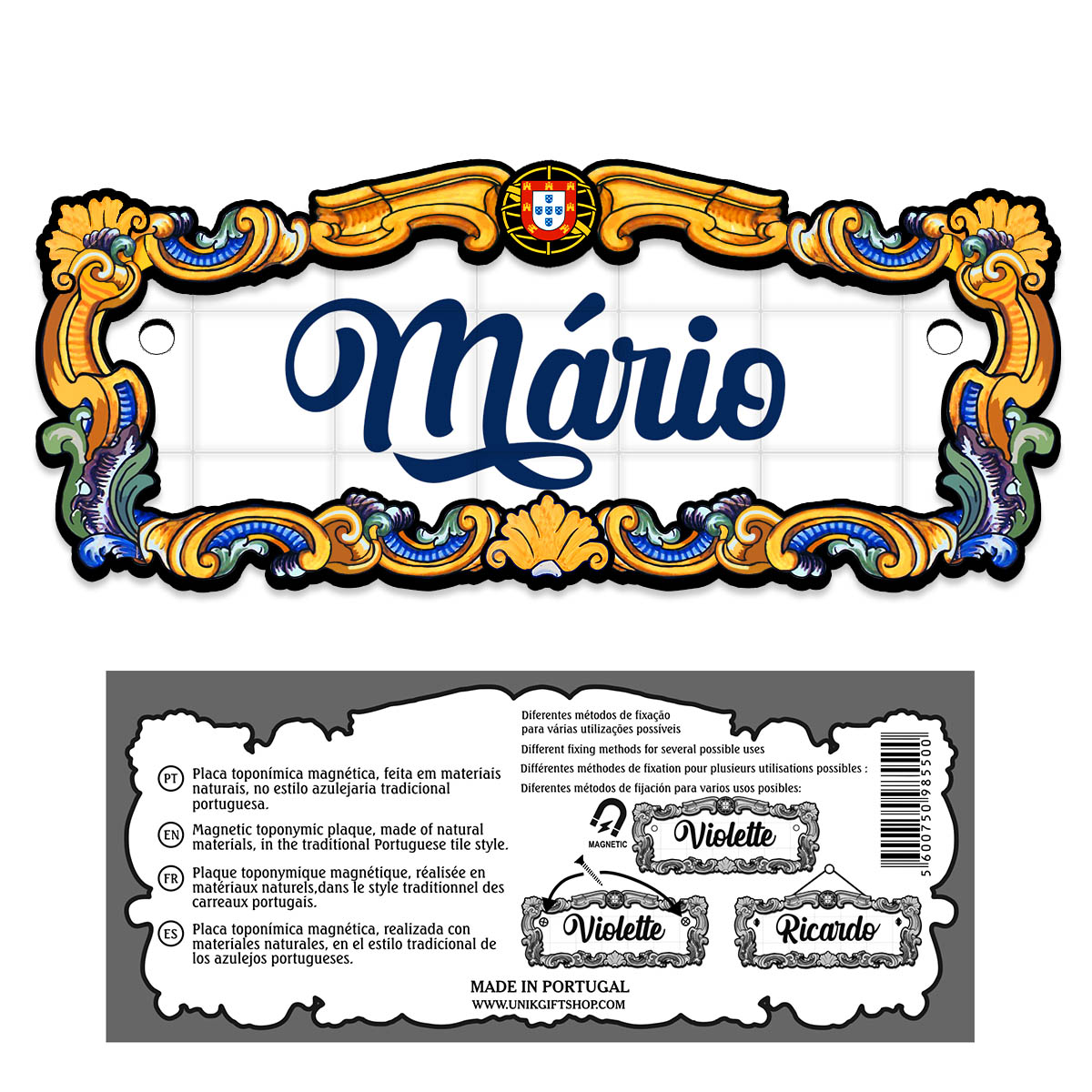 Magnetic toponymic plaque, made of natural materials, in the traditional Portuguese tile style, 14x6cm.