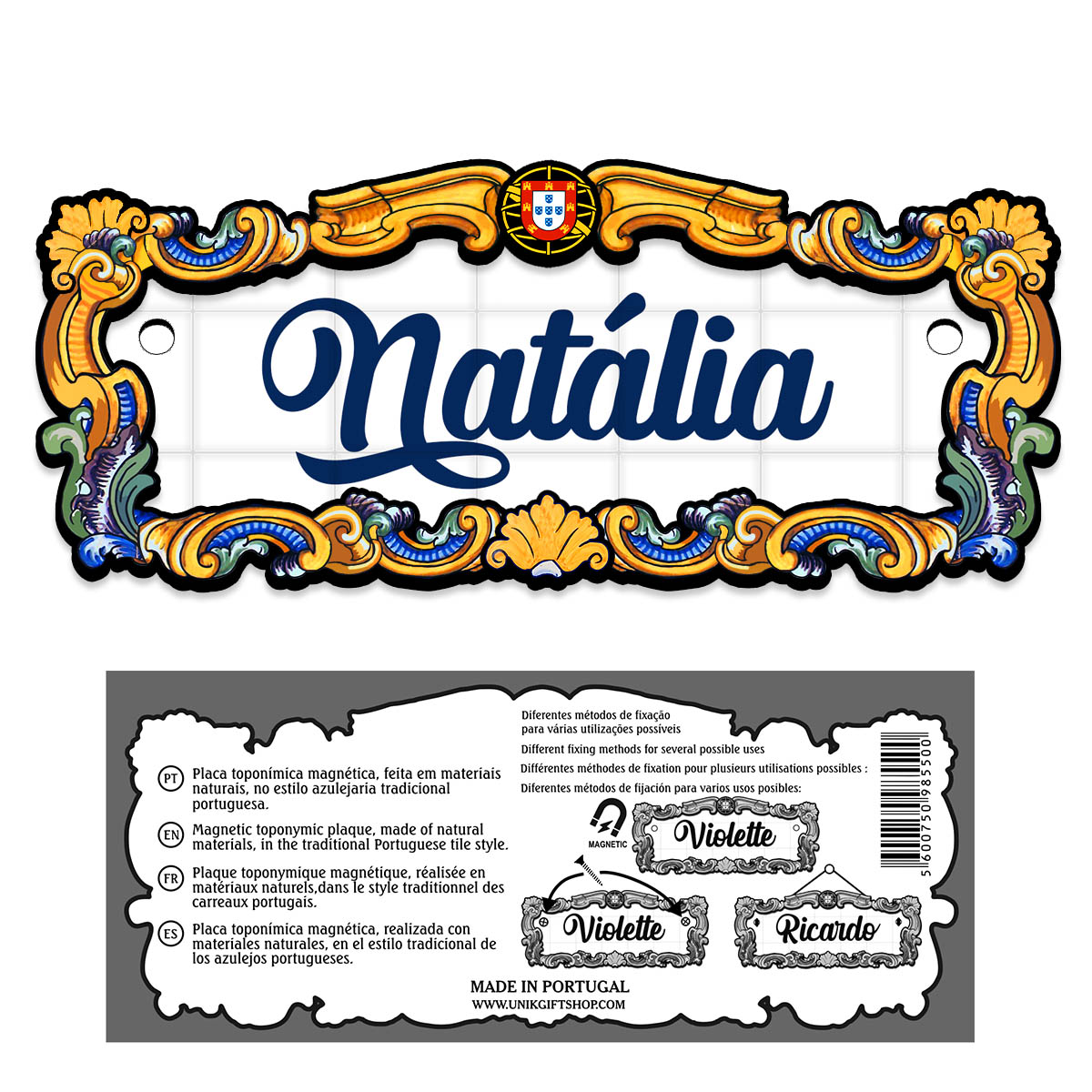Magnetic toponymic plaque, made of natural materials, in the traditional Portuguese tile style, 14x6cm.