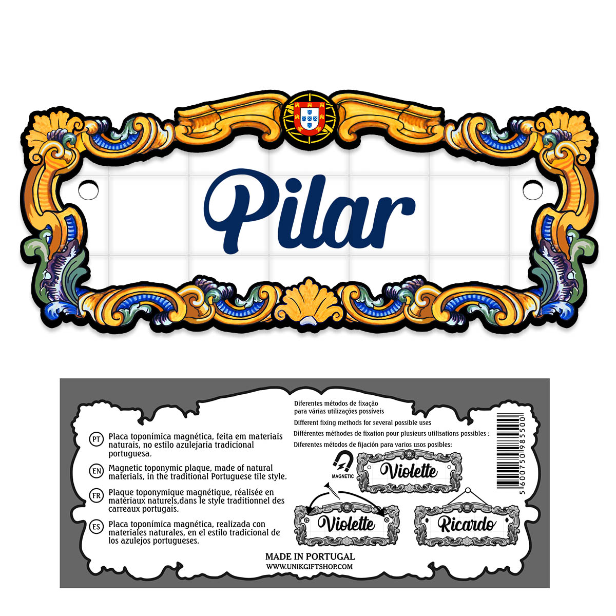Magnetic toponymic plaque, made of natural materials, in the traditional Portuguese tile style, 14x6cm.