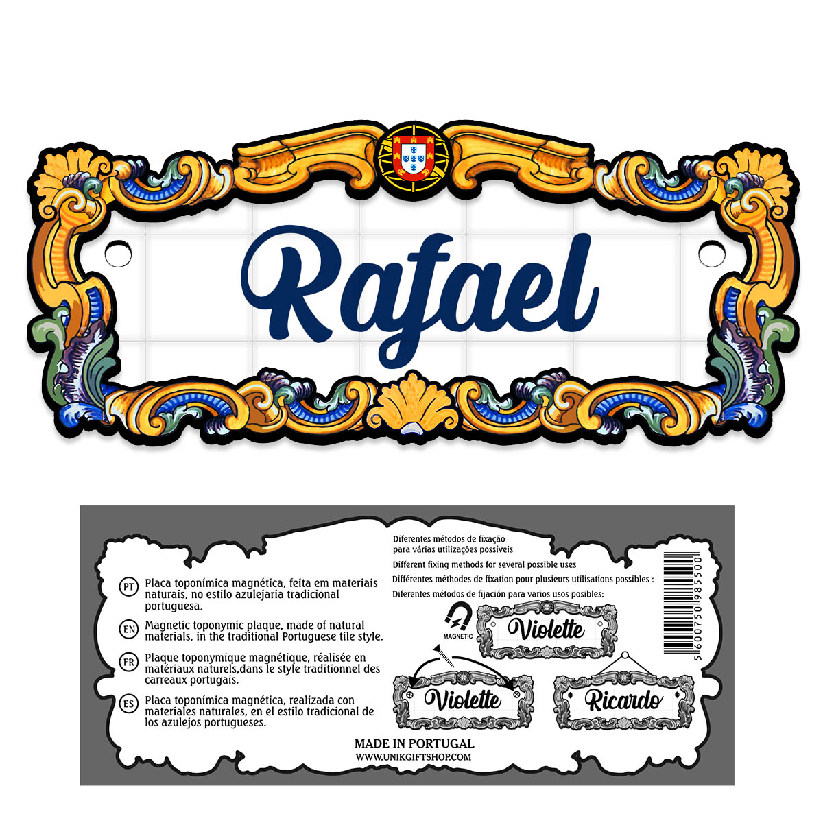 Magnetic toponymic plaque, made of natural materials, in the traditional Portuguese tile style, 14x6cm.