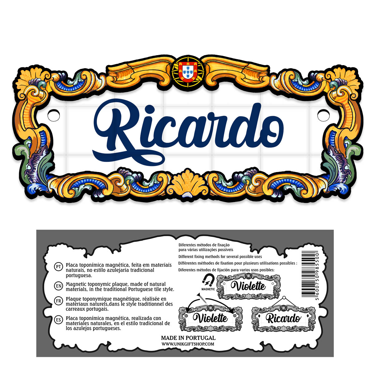 Magnetic toponymic plaque, made of natural materials, in the traditional Portuguese tile style, 14x6cm.
