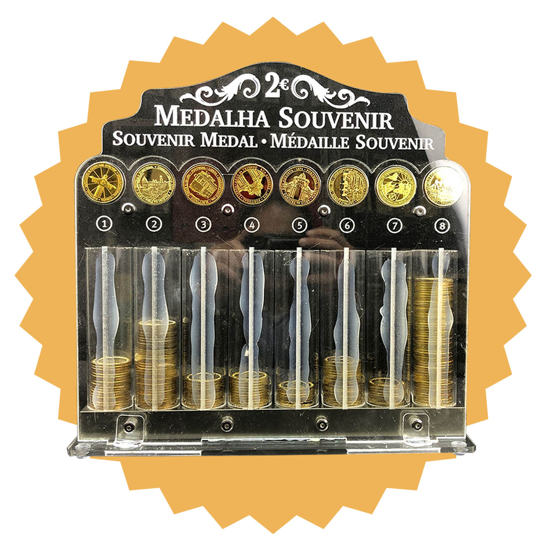 Distributor of tourist medals (medal with diameter 3.4cm), for 8 references, with 320 medals - 10% discount included. Dimensions: 35 x 33 x 8cm Weight: 1kg