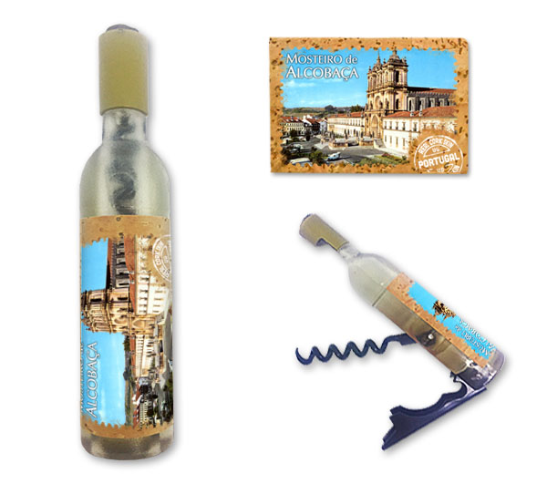 Magnetic in 11,5x2,5cm, bottle format, with capsule openers and corkscrews. Application of printed natural cork, in individual packaging.