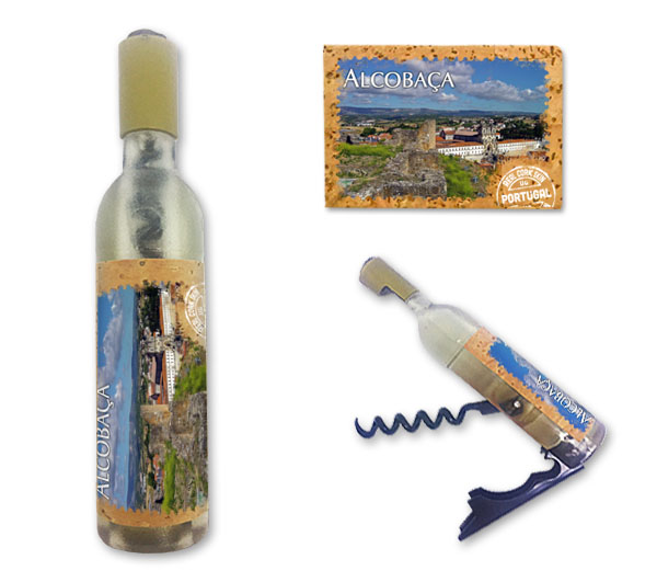 Magnetic in 11,5x2,5cm, bottle format, with capsule openers and corkscrews. Application of printed natural cork, in individual packaging.
