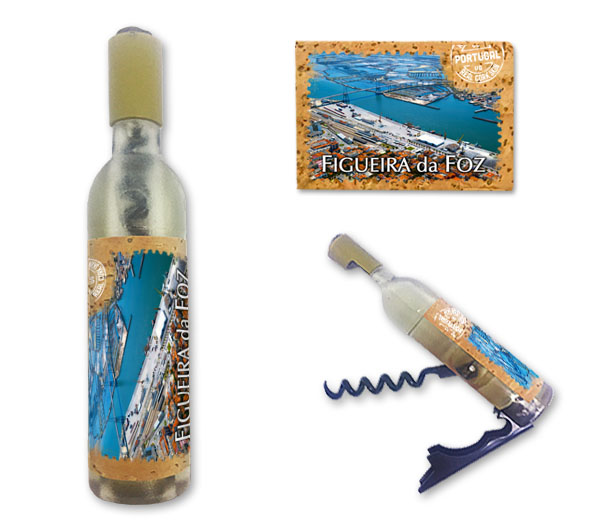 Magnetic in 11,5x2,5cm, bottle format, with capsule openers and corkscrews. Application of printed natural cork, in individual packaging.