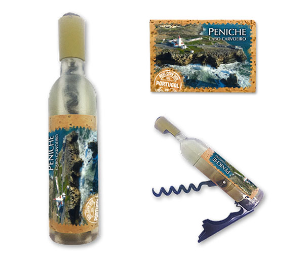 Magnetic in 11,5x2,5cm, bottle format, with capsule openers and corkscrews. Application of printed natural cork, in individual packaging.