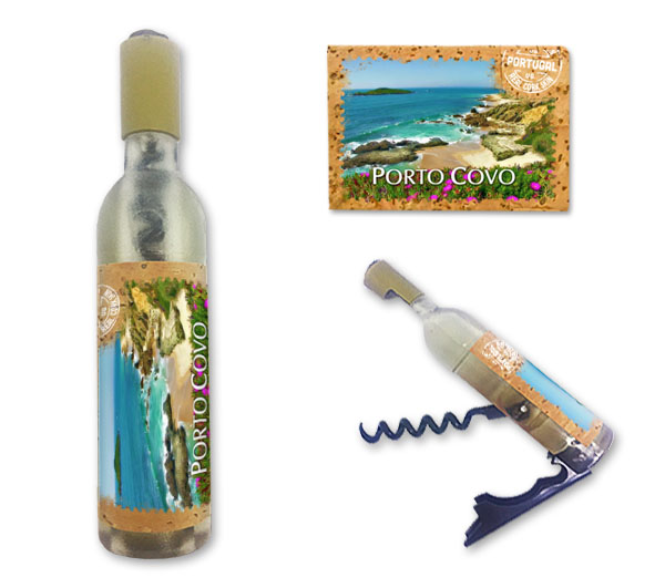 Magnetic in 11,5x2,5cm, bottle format, with capsule openers and corkscrews. Application of printed natural cork, in individual packaging.