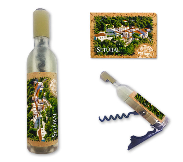 Magnetic in 11,5x2,5cm, bottle format, with capsule openers and corkscrews. Application of printed natural cork, in individual packaging.