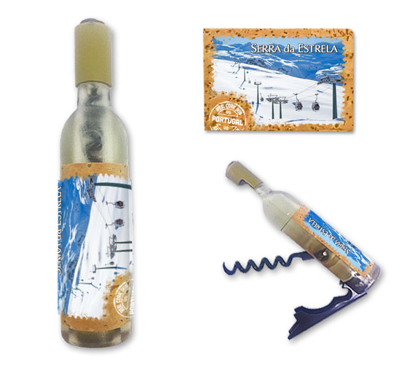Magnetic in 11,5x2,5cm, bottle format, with capsule openers and corkscrews. Application of printed natural cork, in individual packaging.