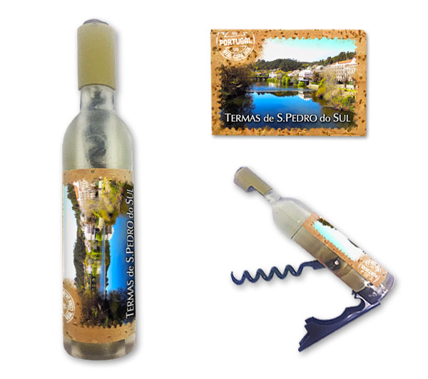 Magnetic in 11,5x2,5cm, bottle format, with capsule openers and corkscrews. Application of printed natural cork, in individual packaging.