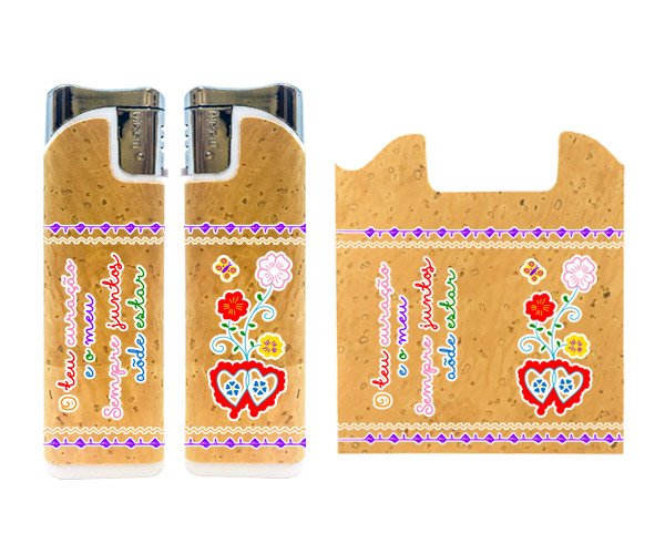 Typical theme of northern Portugal, characterized by misspelling poetry, bright colors and quotidian symbols. Rechargeable lighter with printed natural cork lining.