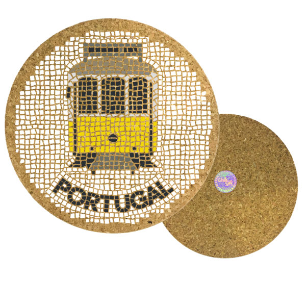 Portuguese symbols, reinterpreted in the shape of the typical Portuguese pavement. Round base for pans, in cork agglomerate of 195mm x 10mm, printed.