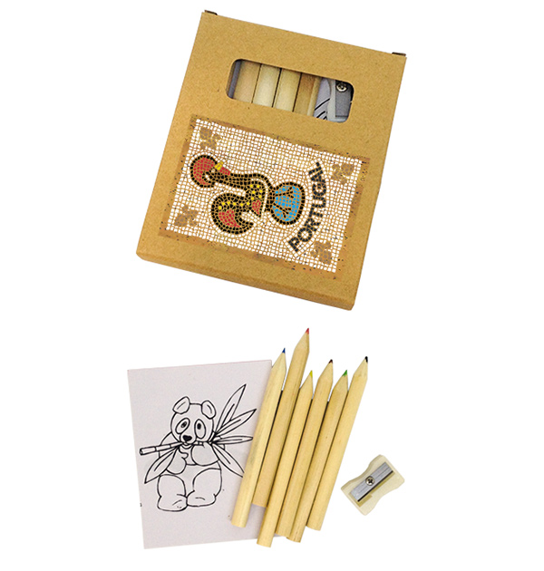 Portuguese symbols, reinterpreted in the shape of the typical Portuguese pavement. Box square pencil 7x9cm, with 6 colored pencils, pencil sharpener, color block and colored illustration in cork.