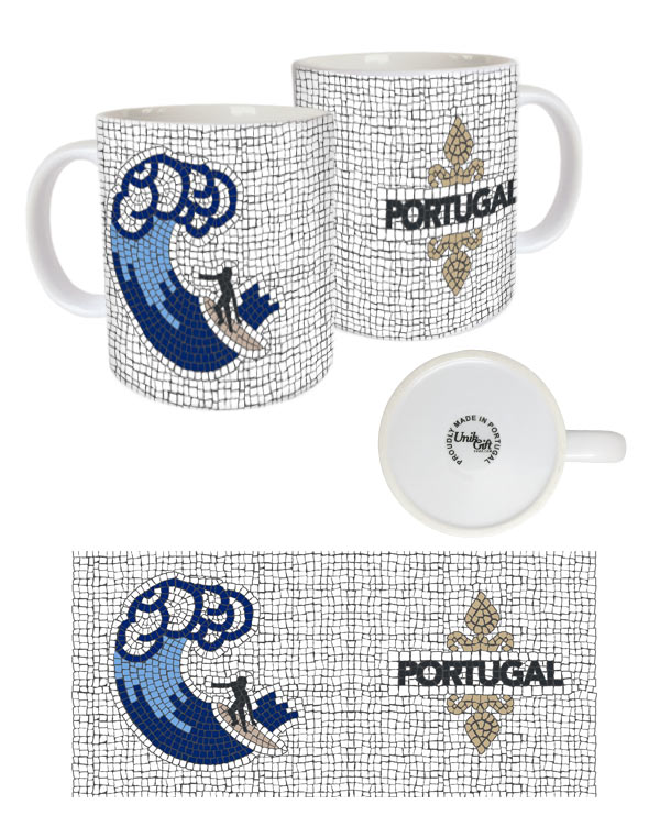Portuguese symbols, reinterpreted in the shape of the typical Portuguese pavement. White Bright White Ceramic Mug, 11oz, 9.7cm x8.2cm diam. Without individual box.