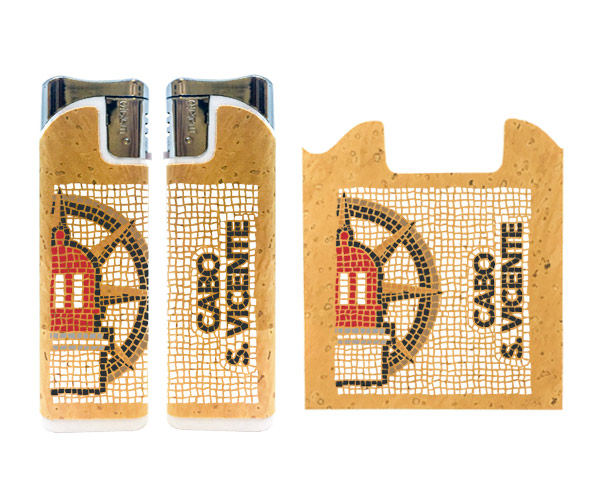 Portuguese symbols, reinterpreted in the shape of the typical Portuguese pavement. Rechargeable lighter with printed natural cork lining.