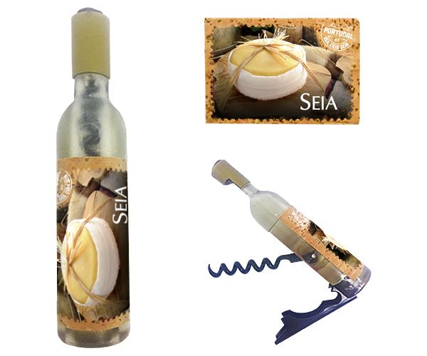 Magnetic in 11,5x2,5cm, bottle format, with capsule openers and corkscrews. Application of printed natural cork, in individual packaging.
